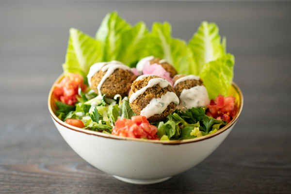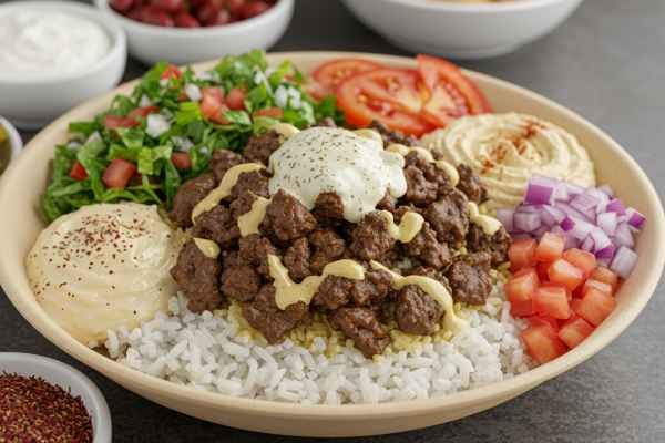 Hand-carved gyro slices made of beef, lamb, breadcrumbs and spices over rice with mix greens, pickles, pickled turnips, hummus, onion-sumac-parsley mix, fresh tomatoes and hummus. Topped with tahini.