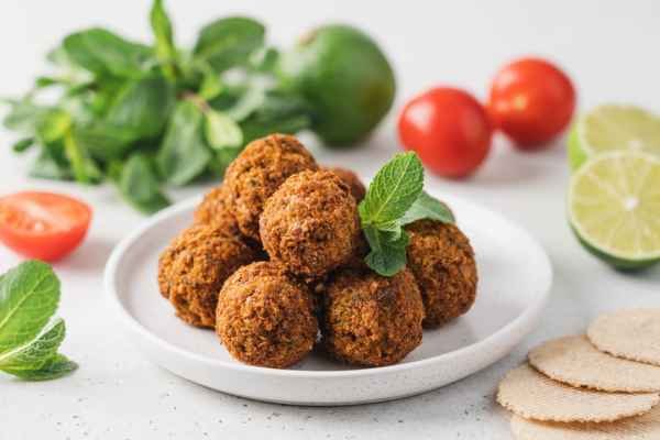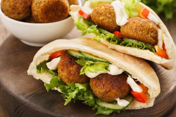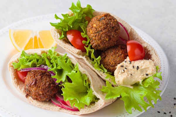 Falafel Pita Sandwich has balls of seasoned ground chickpeas fried in oil, served on a pita with tahini sauce, lettuce, and sliced tomato and cucumber.