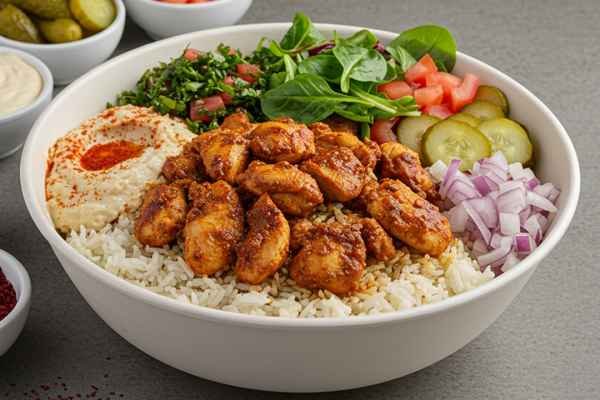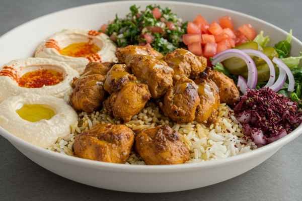 Marinated cubes of chicken breast over rice with mixed greens, pickles, pickled turnip, onion-sumac-parsley mix, fresh tomatoes, and hummus. Topped with tahini.