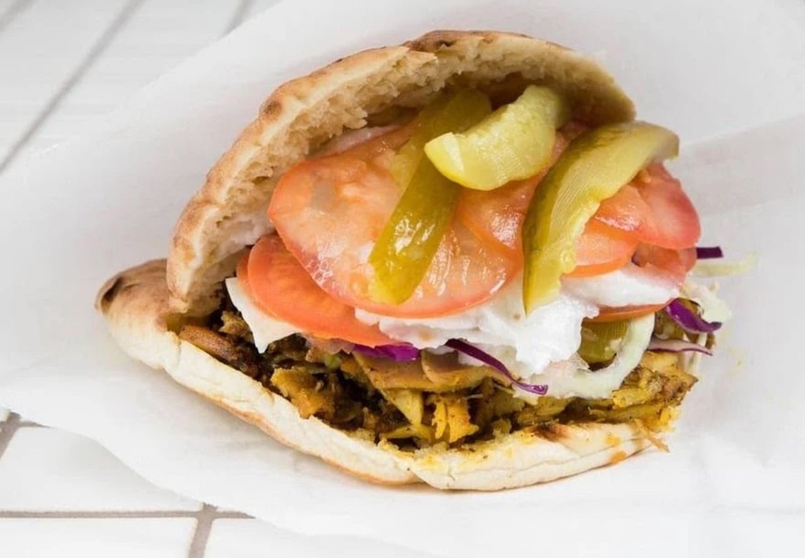 Hand-carved gyro slices made of beef, lamb, breadcrumbs and spices over rice with mix greens, pickles, pickled turnips, hummus, onion-sumac-parsley mix, fresh tomatoes and hummus. Topped with tahini.