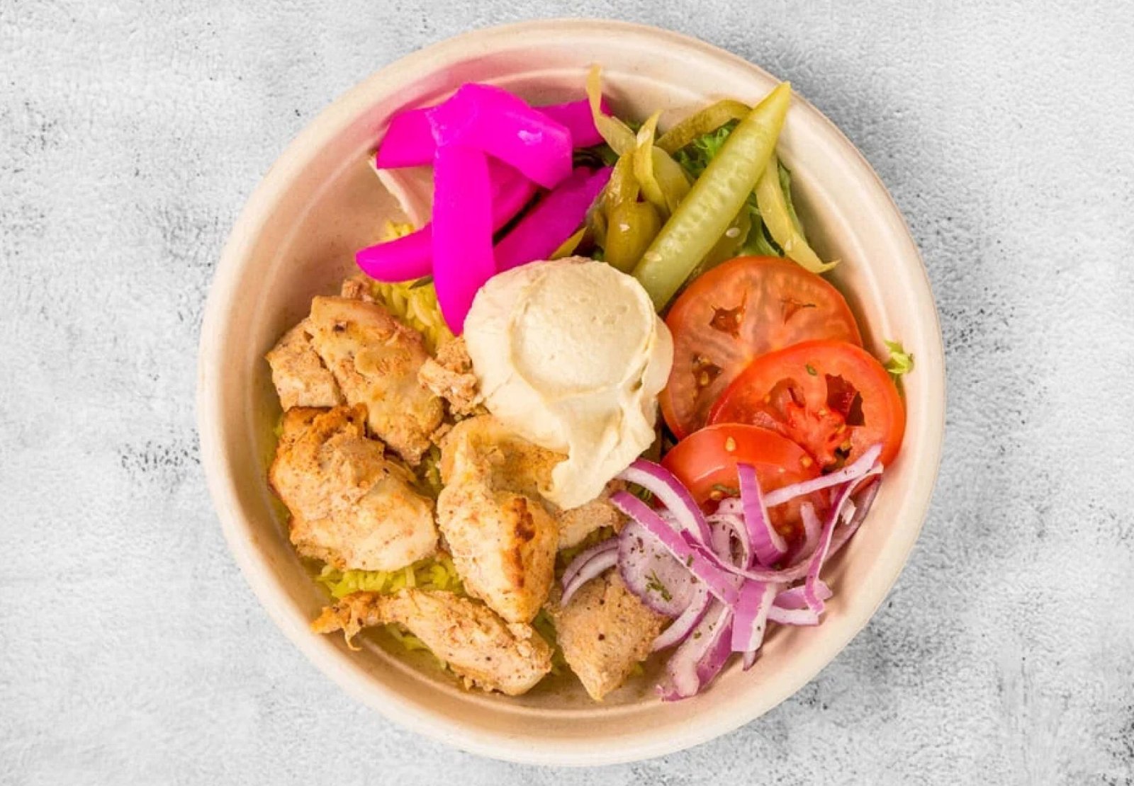 Marinated cubes of chicken breast over rice with mixed greens, pickles, pickled turnip, onion-sumac-parsley mix, fresh tomatoes, and hummus. Topped with tahini.