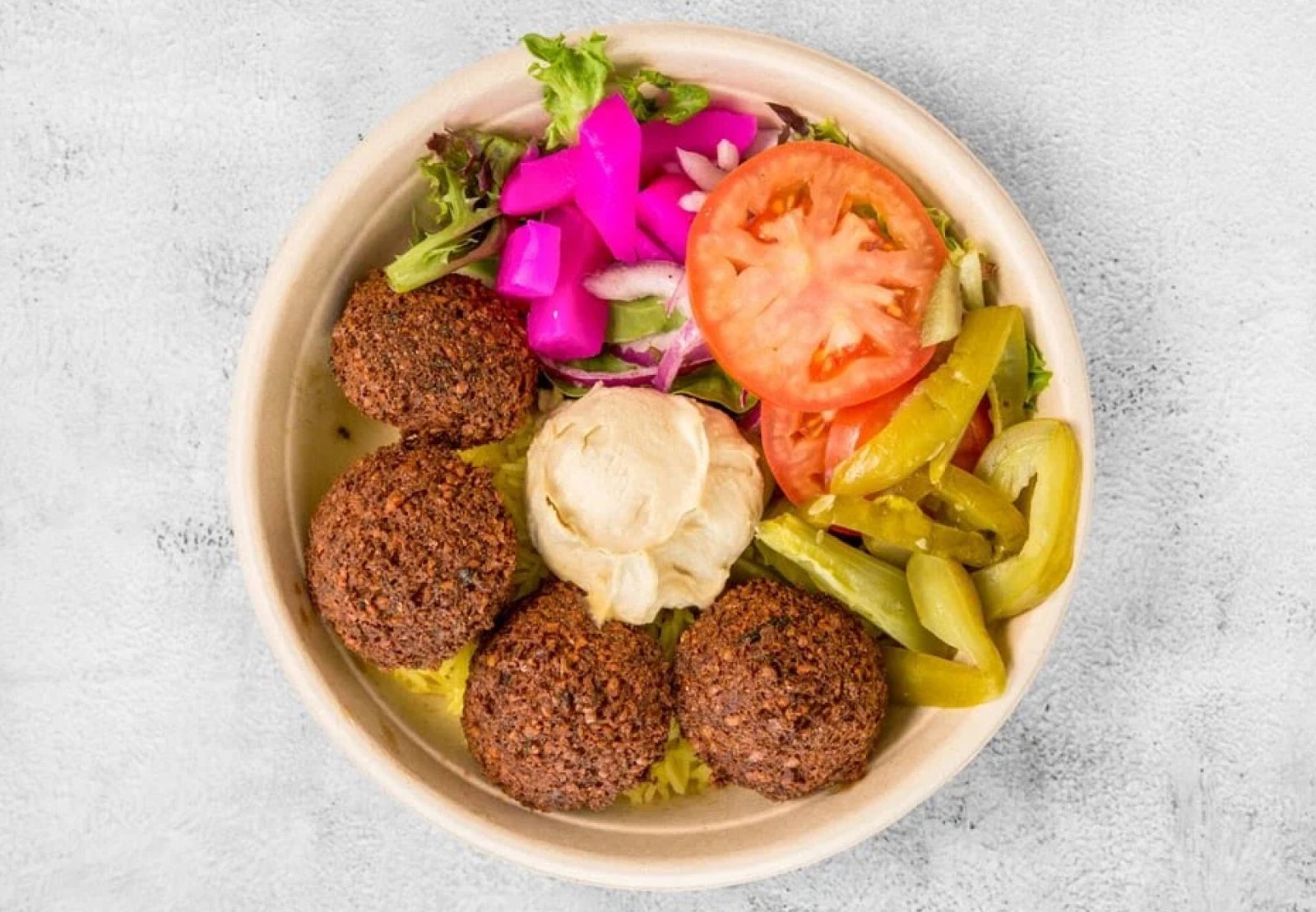 Hummus, spring mix, pickles, pickled turnip, tomato, cucumber, and tahini.
